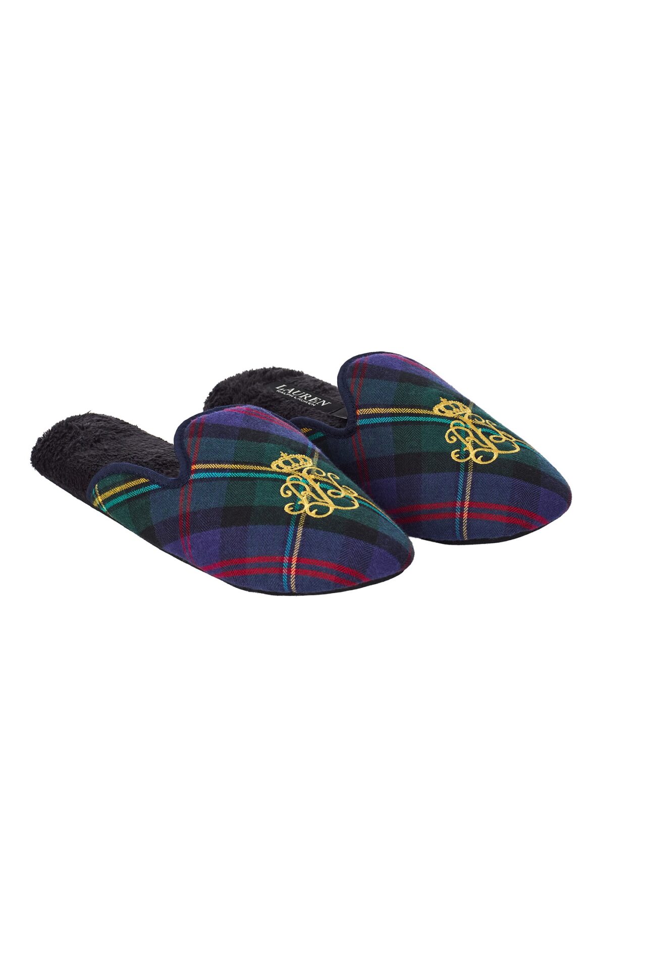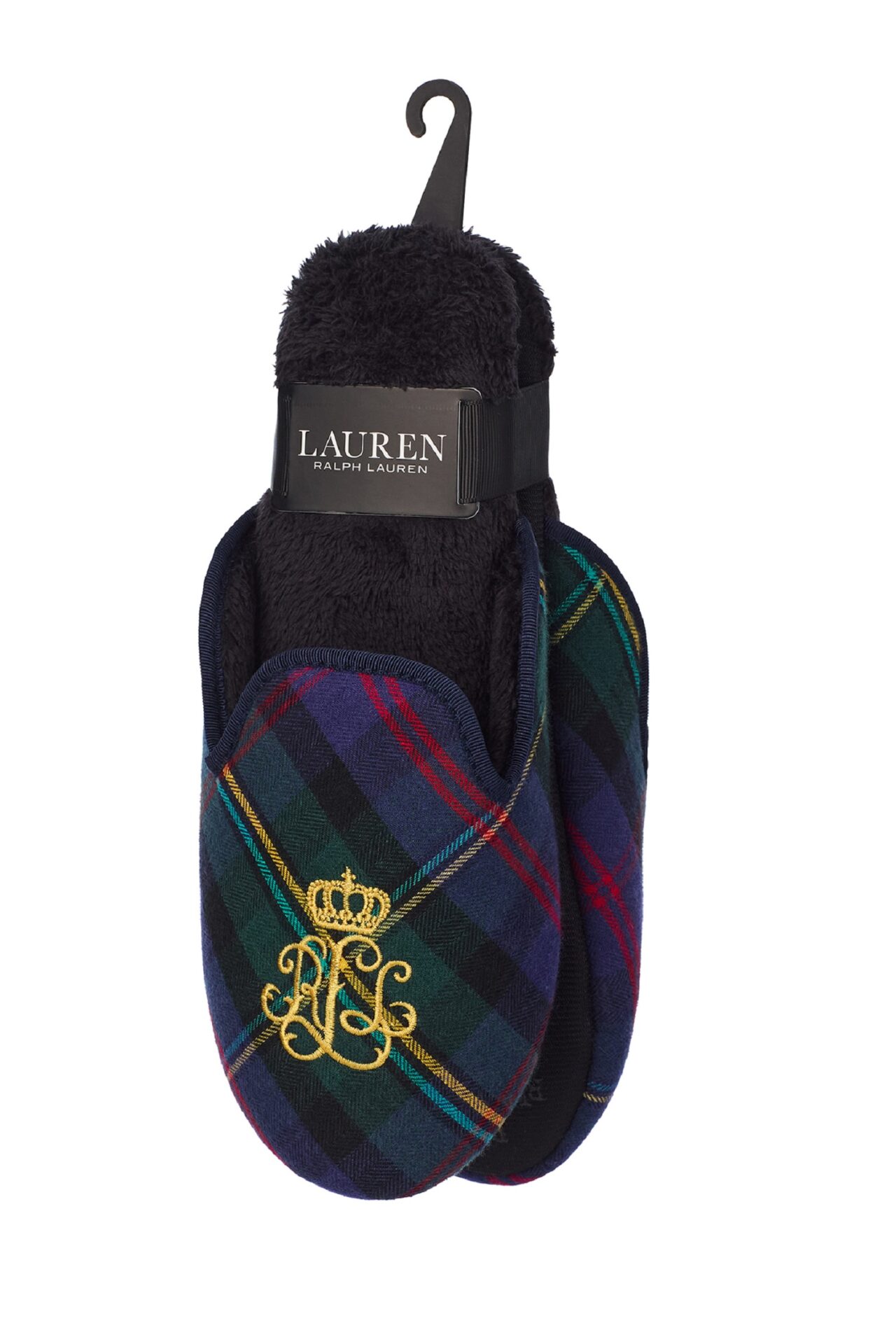 Kapcie damskie z kolekcji Lauren Ralph Lauren, wykonane z mieszanki bawełny i wiskozy w kolorową kratę. Okrągły nosek, z przodu wyszywane logo „LRL” z koroną, wykończone lamówką, miękkie i przyjemne wnętrze. Podeszwa z elementami antypoślizgowymi.