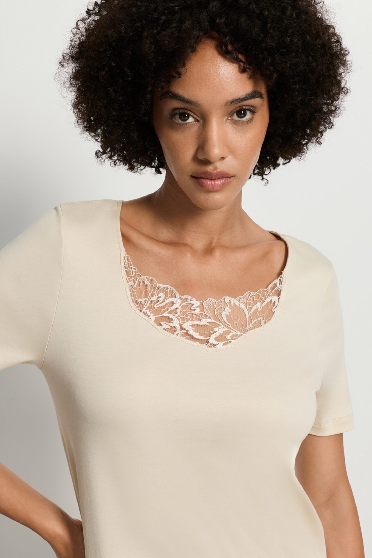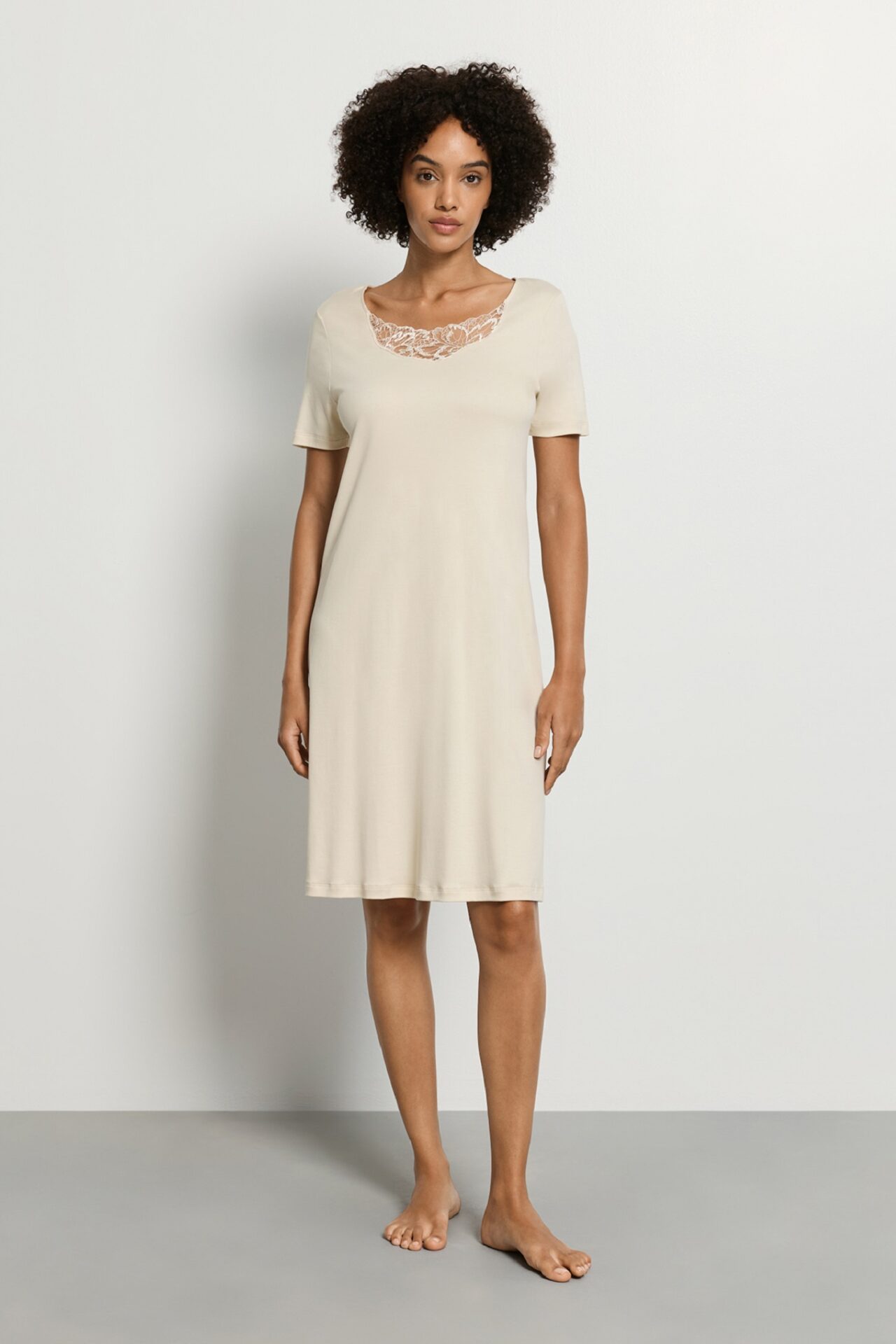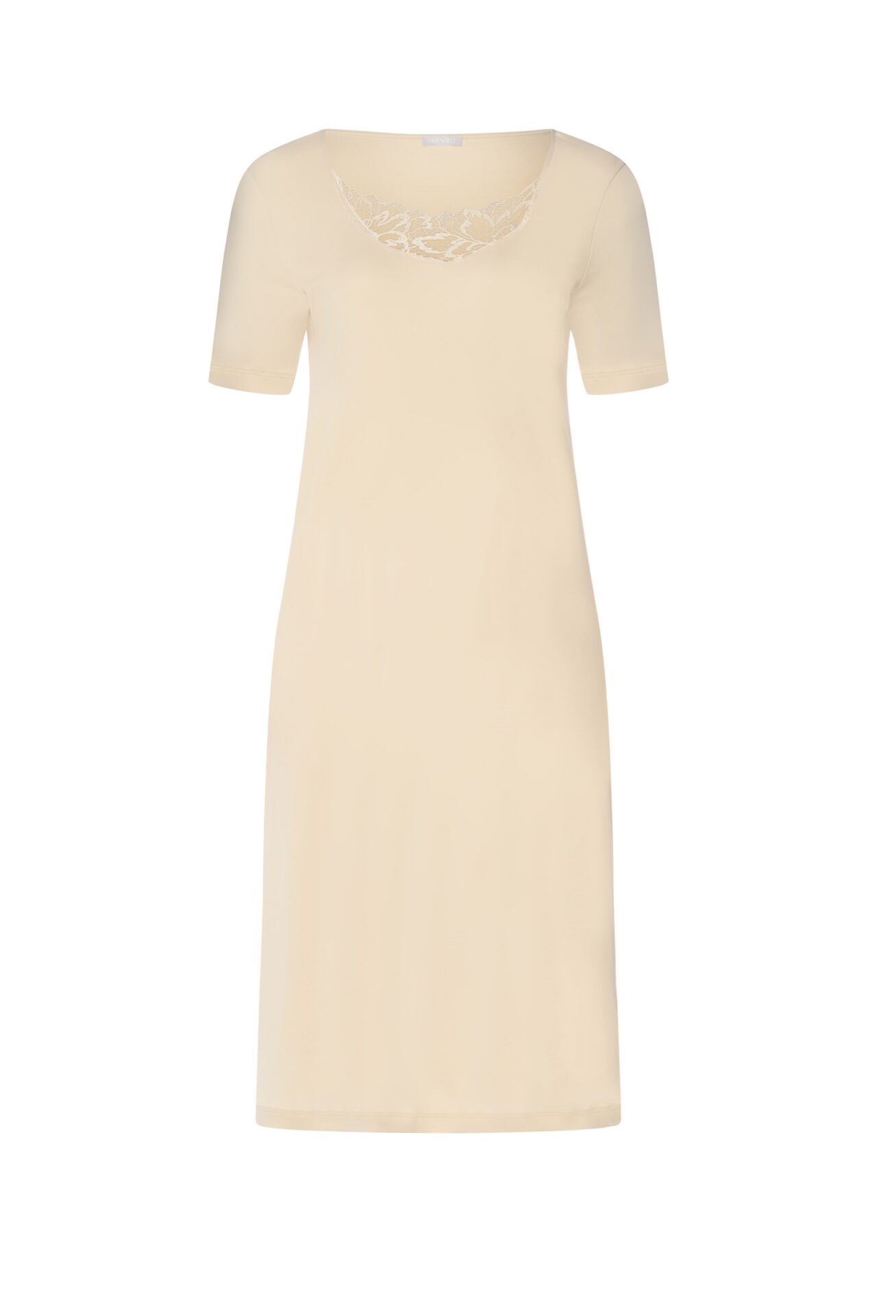 Elegancka koszula nocna z krótkim rękawem Hanro z kolekcji Belen. Wykonana z miękkiej bawełny merceryzowanej z delikatnym połyskiem. Dekolt okrągły, ozdobiony kwiatowym haftem. Długość ok. 100 cm.