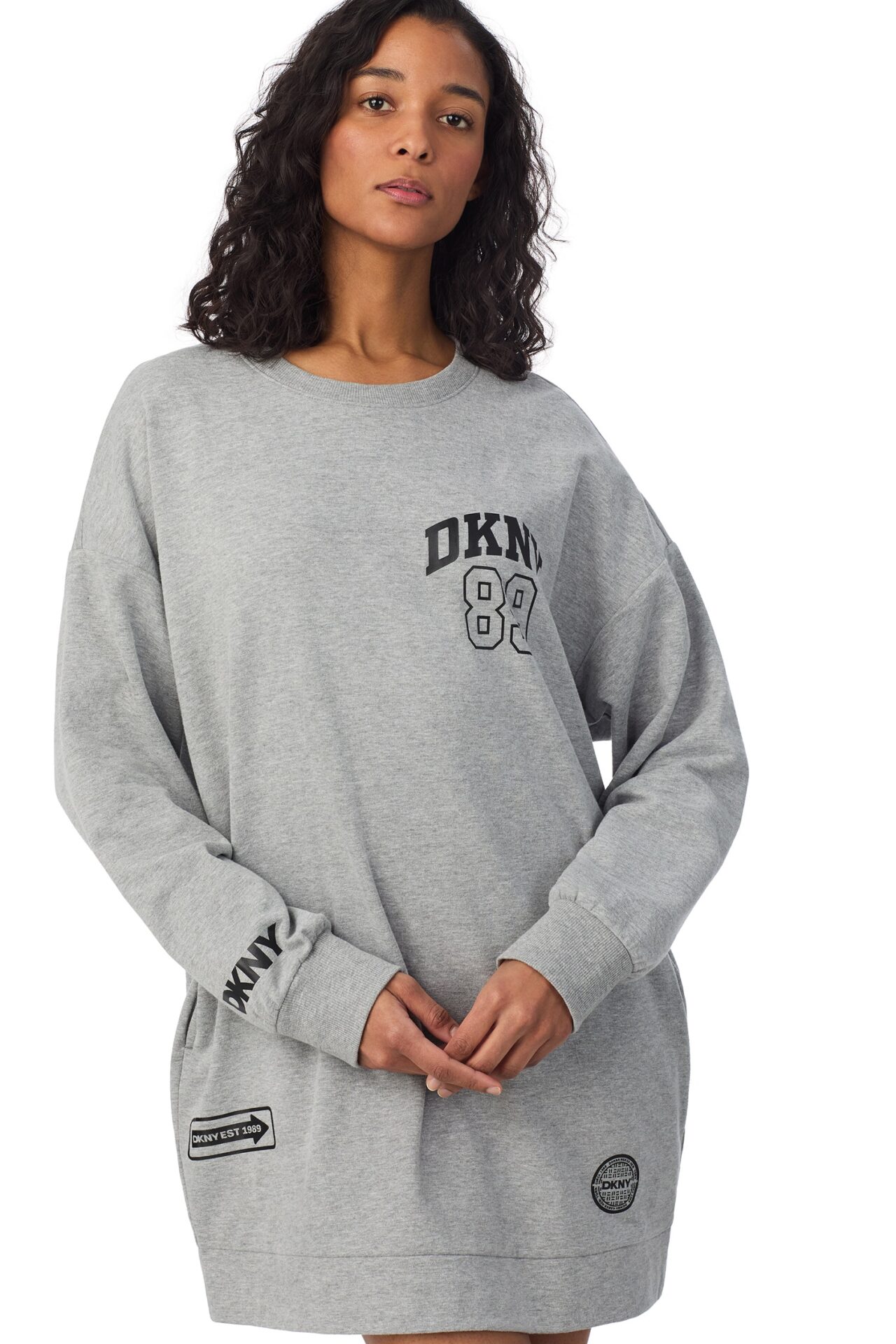 Koszula nocna damska z kolekcji DKNY, wykonana z materiału z dużą zawartością bawełny. Rękaw długi z obniżoną linią ramion. Okrągły dekolt. Rękawy oraz dekolt wykończone ściągaczem. Wsuwane kieszenie boczne. Luźny krój.