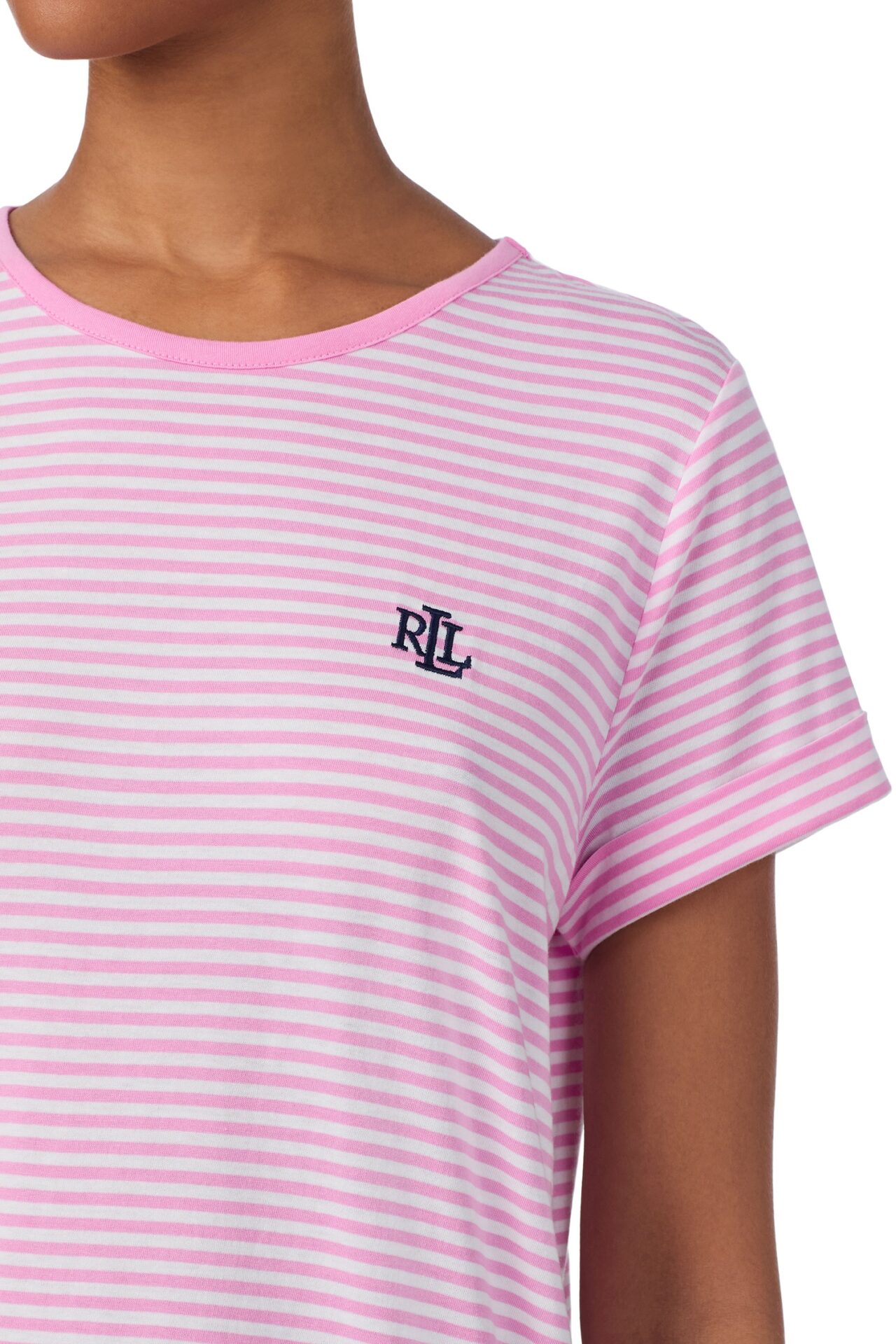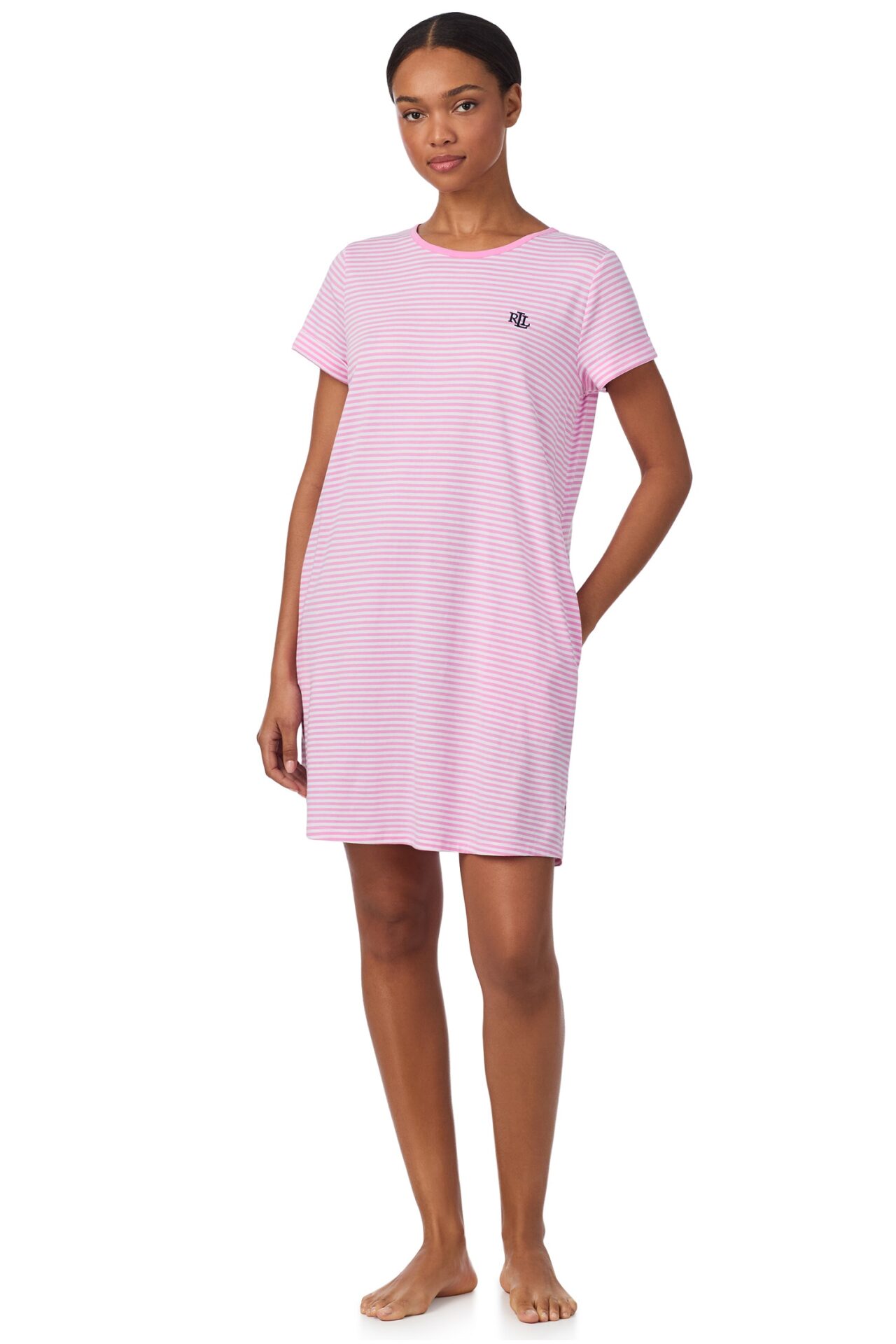 Koszula nocna Lauren Ralph Lauren w różowe paski. Wykonana z miękkiej dzianiny bawełniano-wiskozowej. Rękaw krótki z wywiniętym mankietem. Okrągły dekolt obszyty lamówką. Z lewej strony na piersi haftowane logo „LRL”. Po bokach kieszenie. Małe rozcięcia boczne.