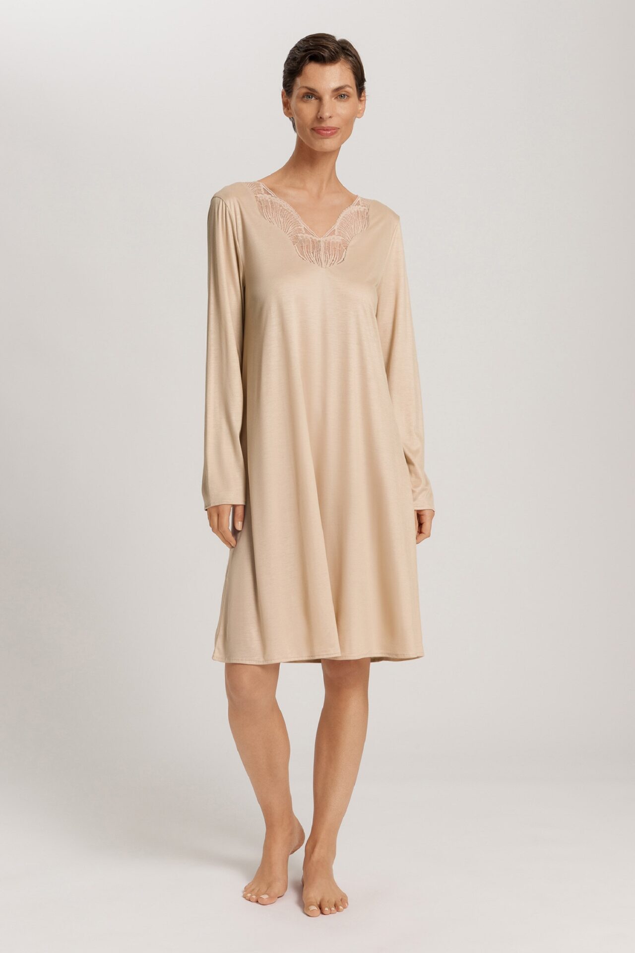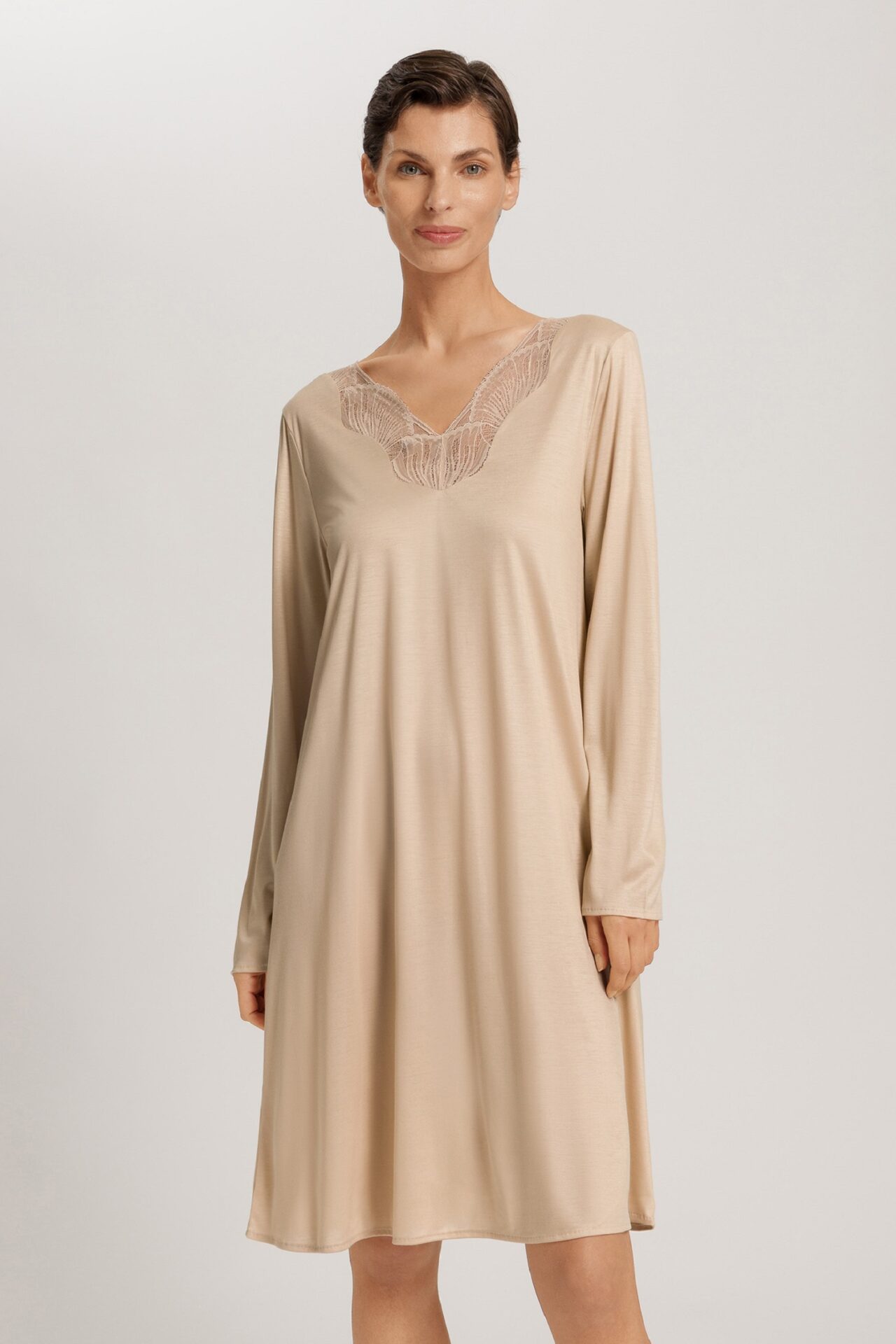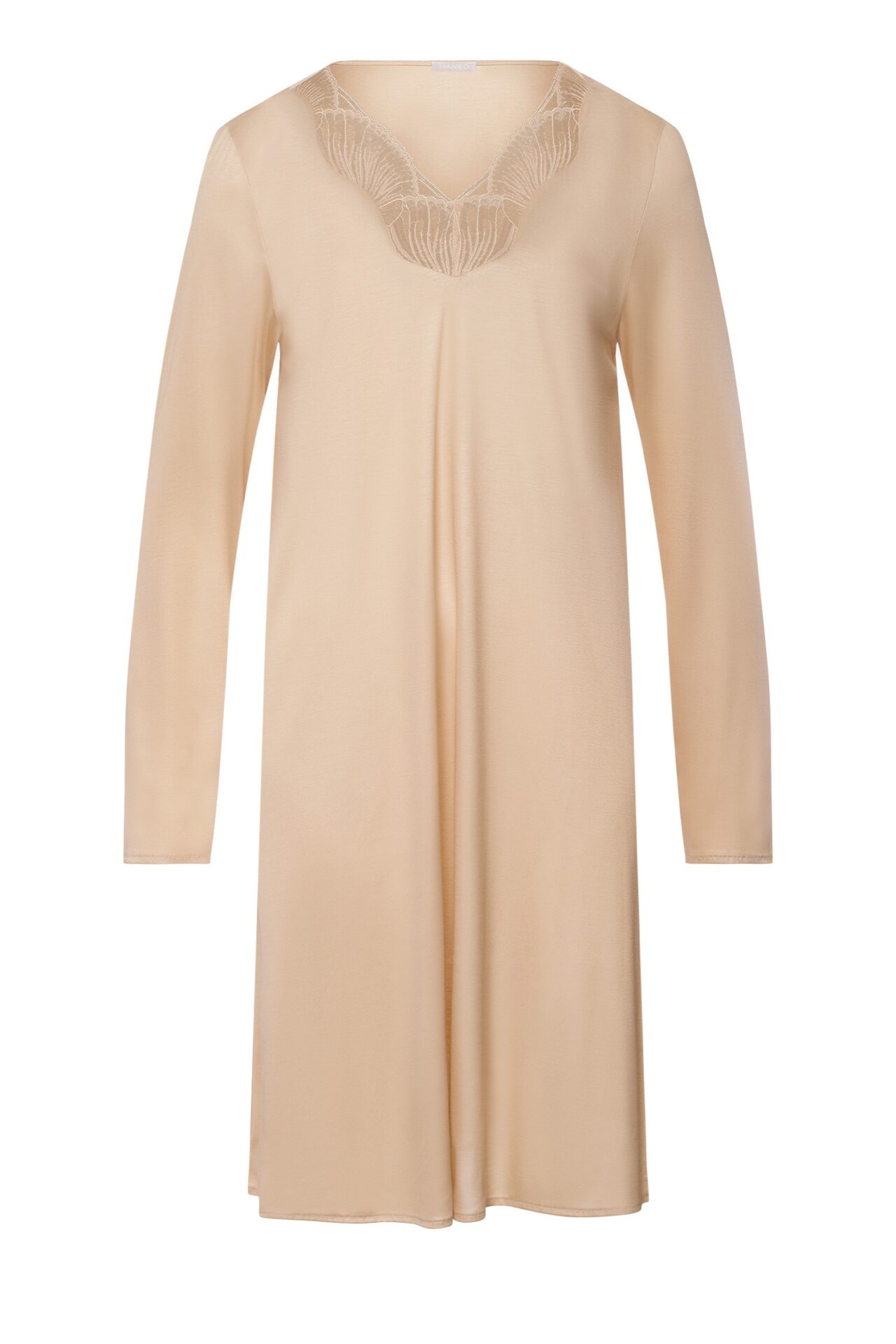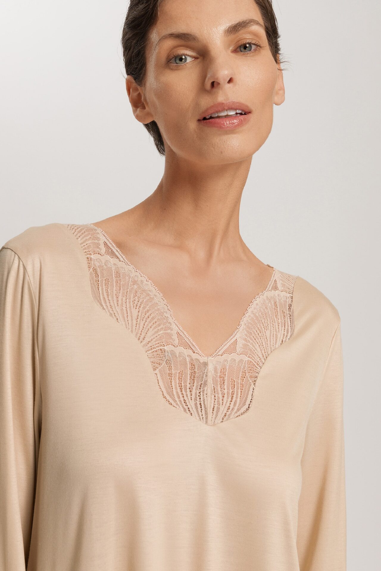 Elegancka koszula nocna z długim rękawem Hanro z kolekcji Lilith, wykonana z miękkiej tkaniny z delikatnym naturalnym połyskiem. Dekolt w kształcie litery V, ozdobiony piękną koronką. Długość ok. 100 cm.