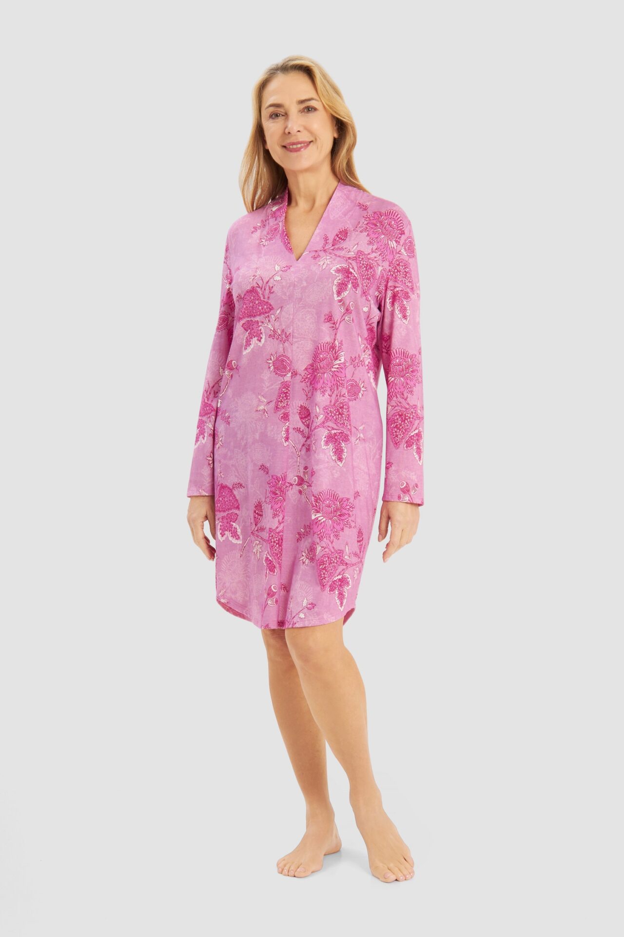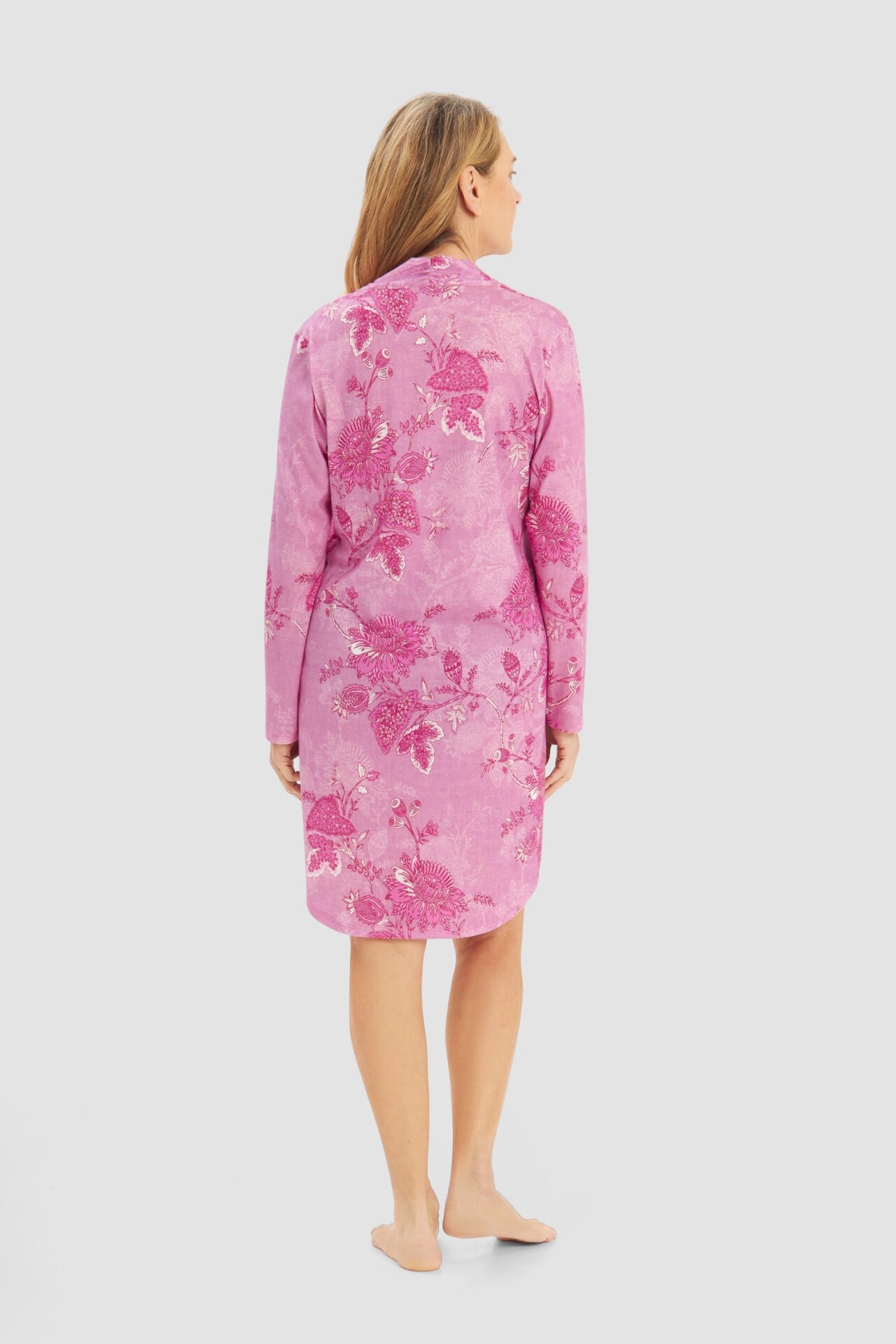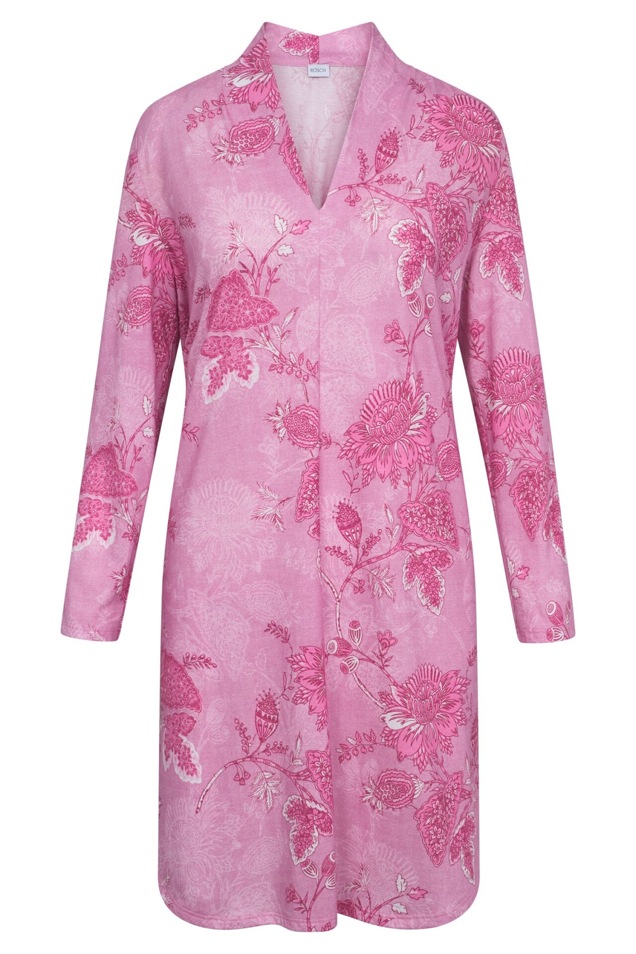 Koszula nocna z długim rękawem Rosch w kwiatowy nadruk. Wykonana z miękkiego i przyjemnego w dotyku materiału. Dekolt w kształcie litery V, lekko zaokrąglony dół. Długość ok. 95 cm.