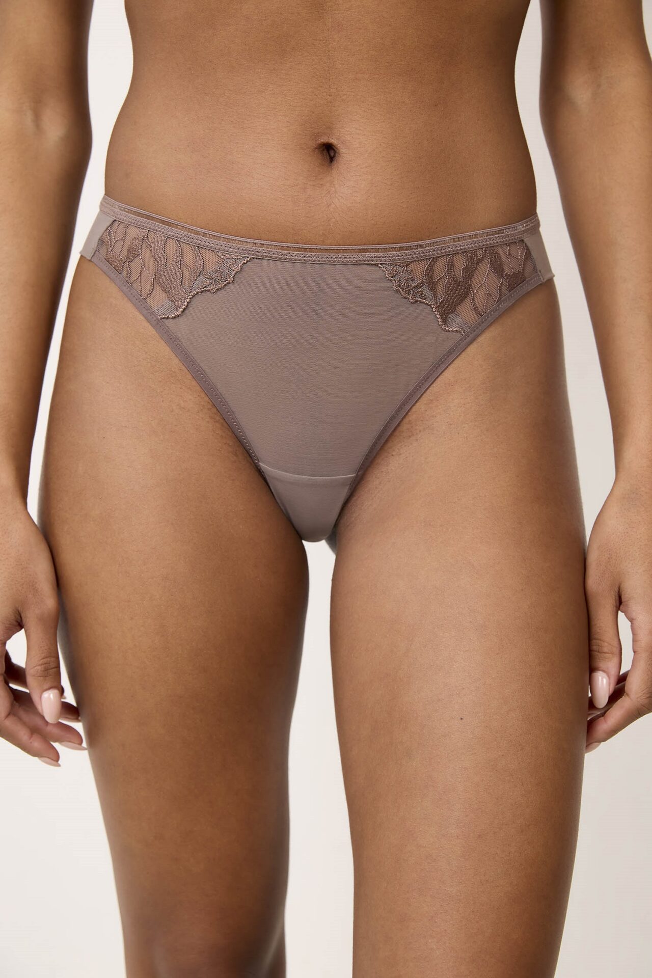 Majtki tanga Maison Lejaby z kolekcji Sin. Wykonane z elastycznego opalizującego tiulu, na bokach delikatny haft z motywem liści.