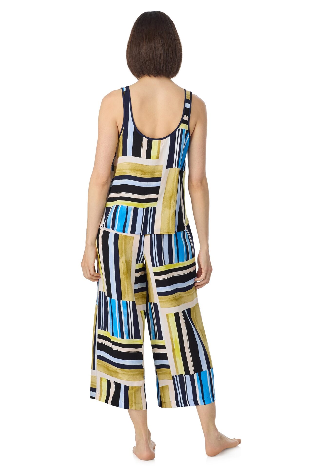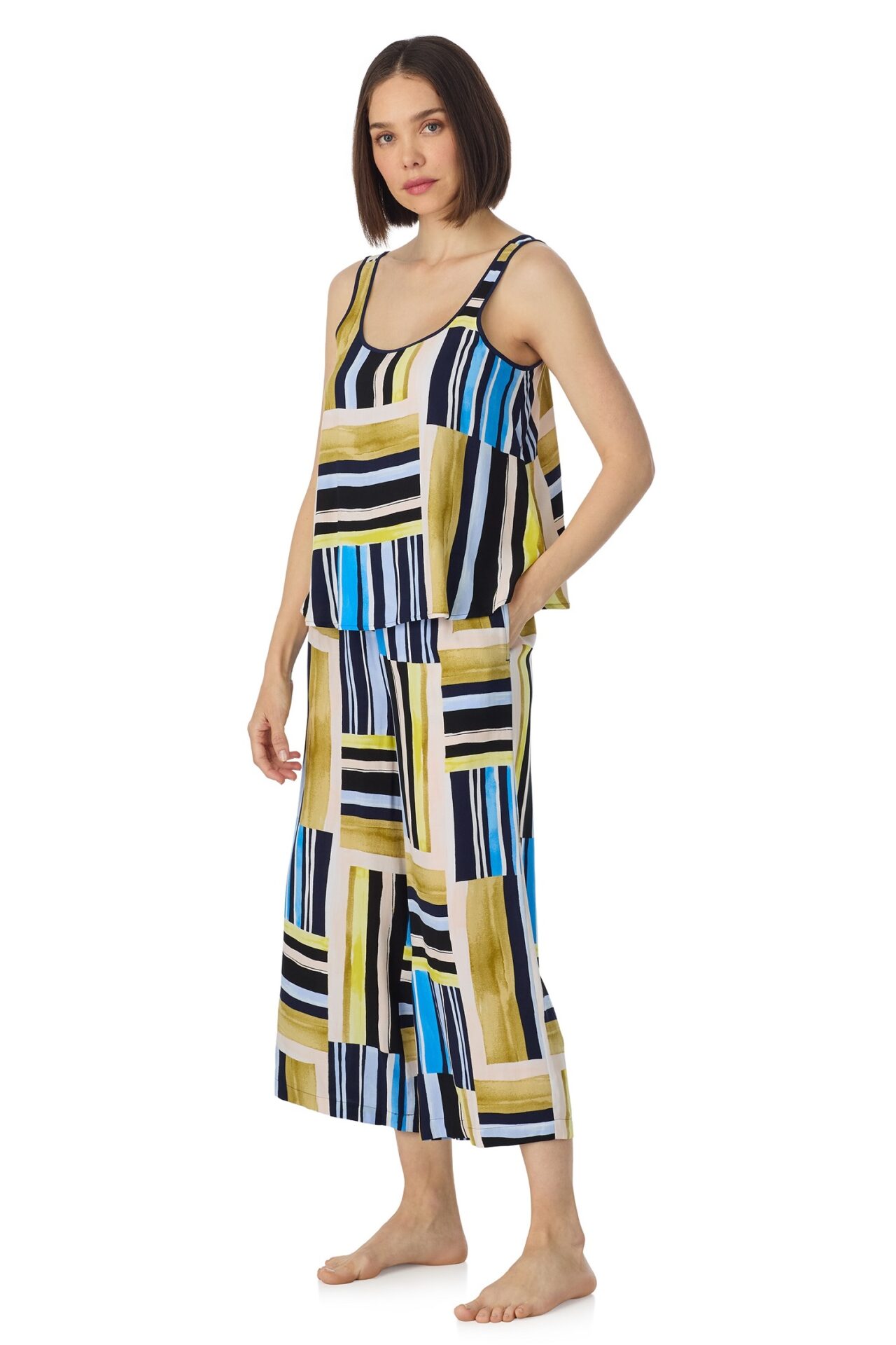 Piżama damska od DKNY. Wykonana z lekkiej i przewiewnej tkaniny wiskozowej w kolorowe pasy. Top na ramiączkach z okrągłym dekoltem. Spodnie o długości 7/8 z szeroką nogawką. Elastyczny pas z wiązaniem. Wygodne wsuwane kieszenie boczne.