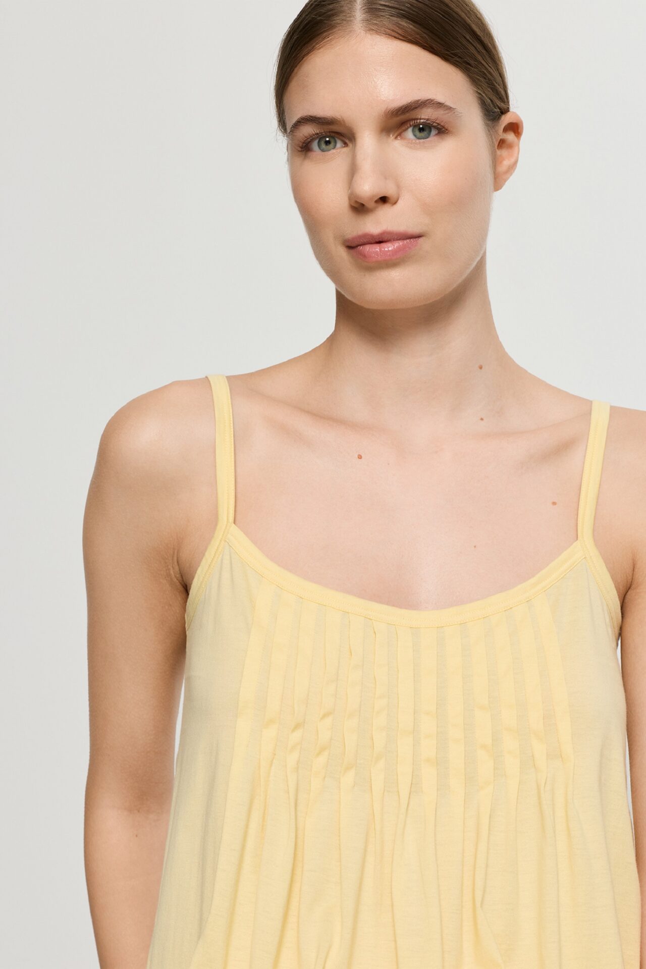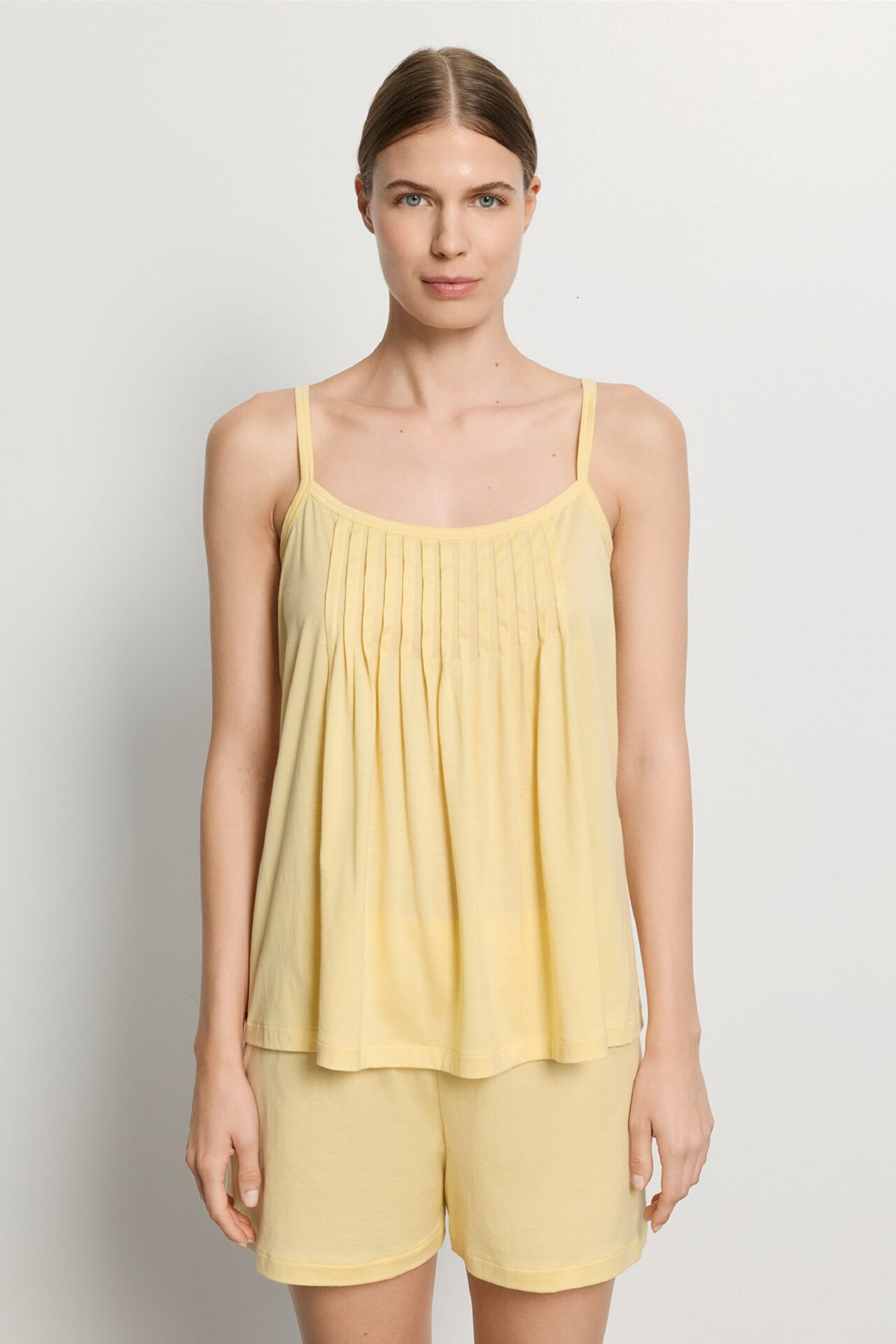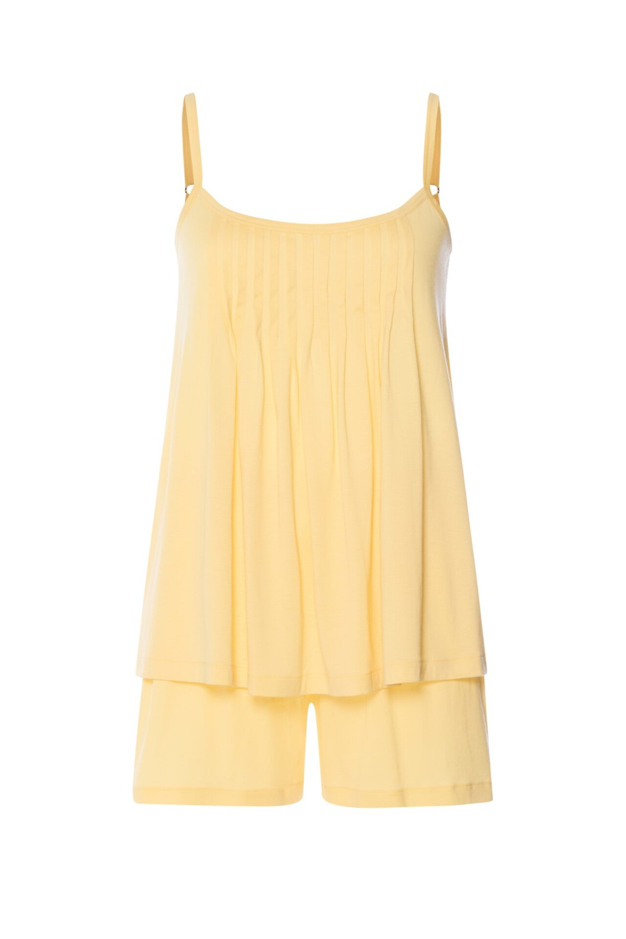 Piżama damska krótka Hanro z kolekcji Juliet, wykonana z miękkiej bawełny merceryzowanej. Top na cienkich regulowanych ramiączkach, okrągły dekolt, ozdobne plisy. Krótkie spodenki z wygodnym elastycznym pasem.