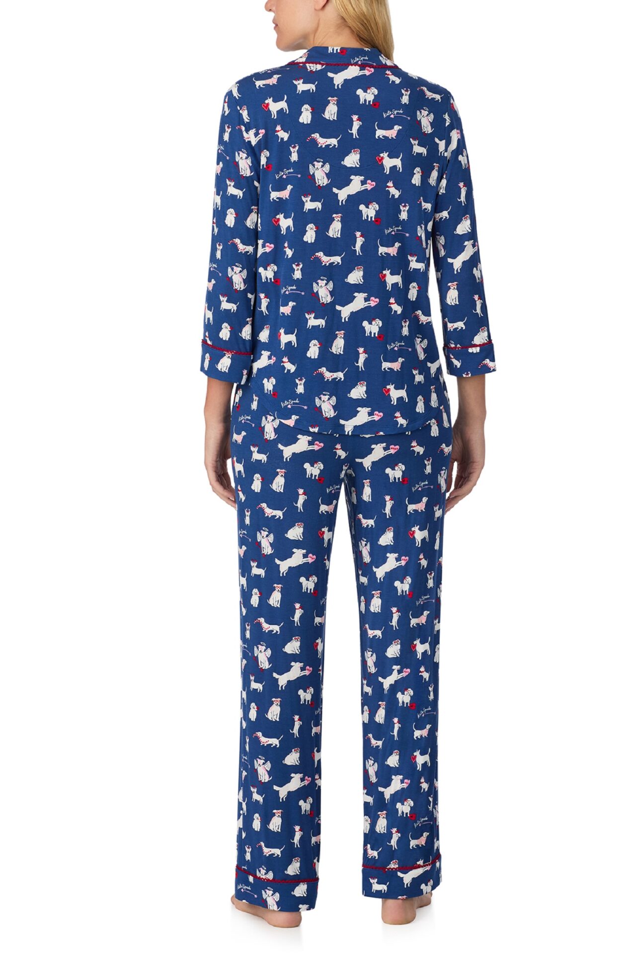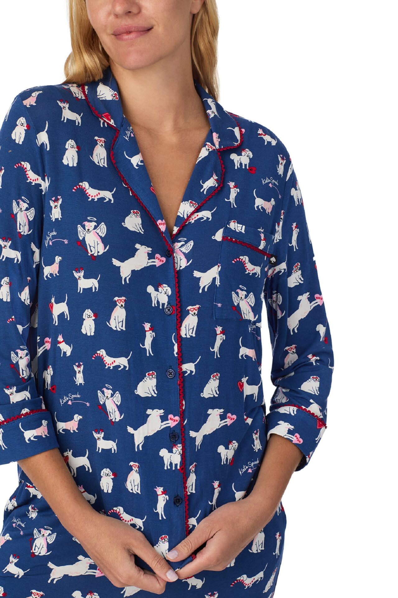 Piżama damska z kolekcji Kate Spade wykonana z przyjemnego modalu w pieski. Koszula z kołnierzykiem zapinana na guziki. Rękaw ¾ wykończony mankietem. Mała kieszonka na piersi. Spodnie długie z prostą nogawką. Elastyczny pas. Wsuwane kieszenie boczne. Piżama ozdobiona czerwoną lamówką.