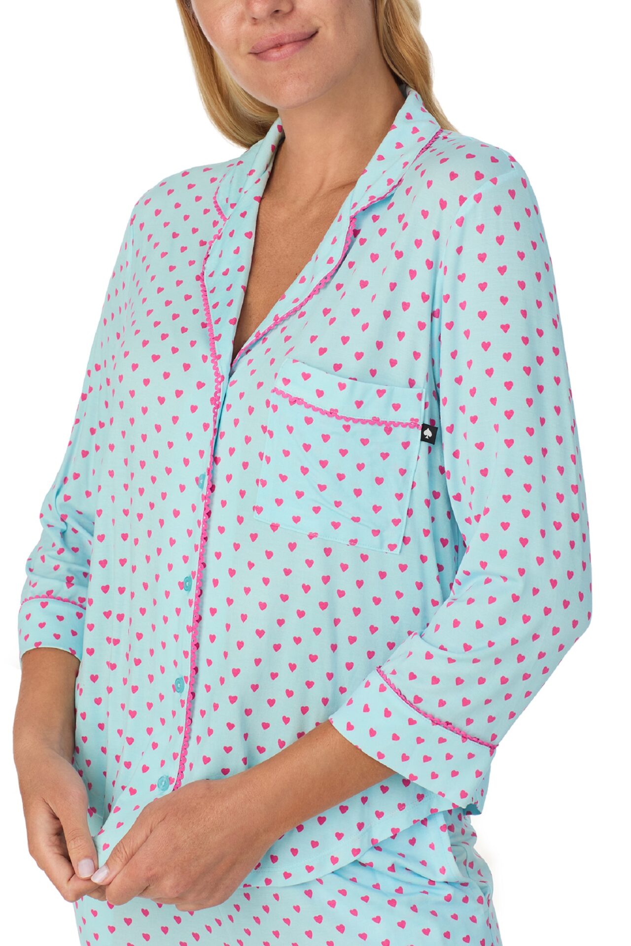 Piżama damska z kolekcji Kate Spade wykonana z przyjemnego modalu w serduszka. Koszula z kołnierzykiem zapinana na guziki. Rękaw ¾ wykończony mankietem. Mała kieszonka na piersi. Spodnie długie z prostą nogawką. Elastyczny pas. Wsuwane kieszenie boczne. Piżama ozdobiona różową lamówką.