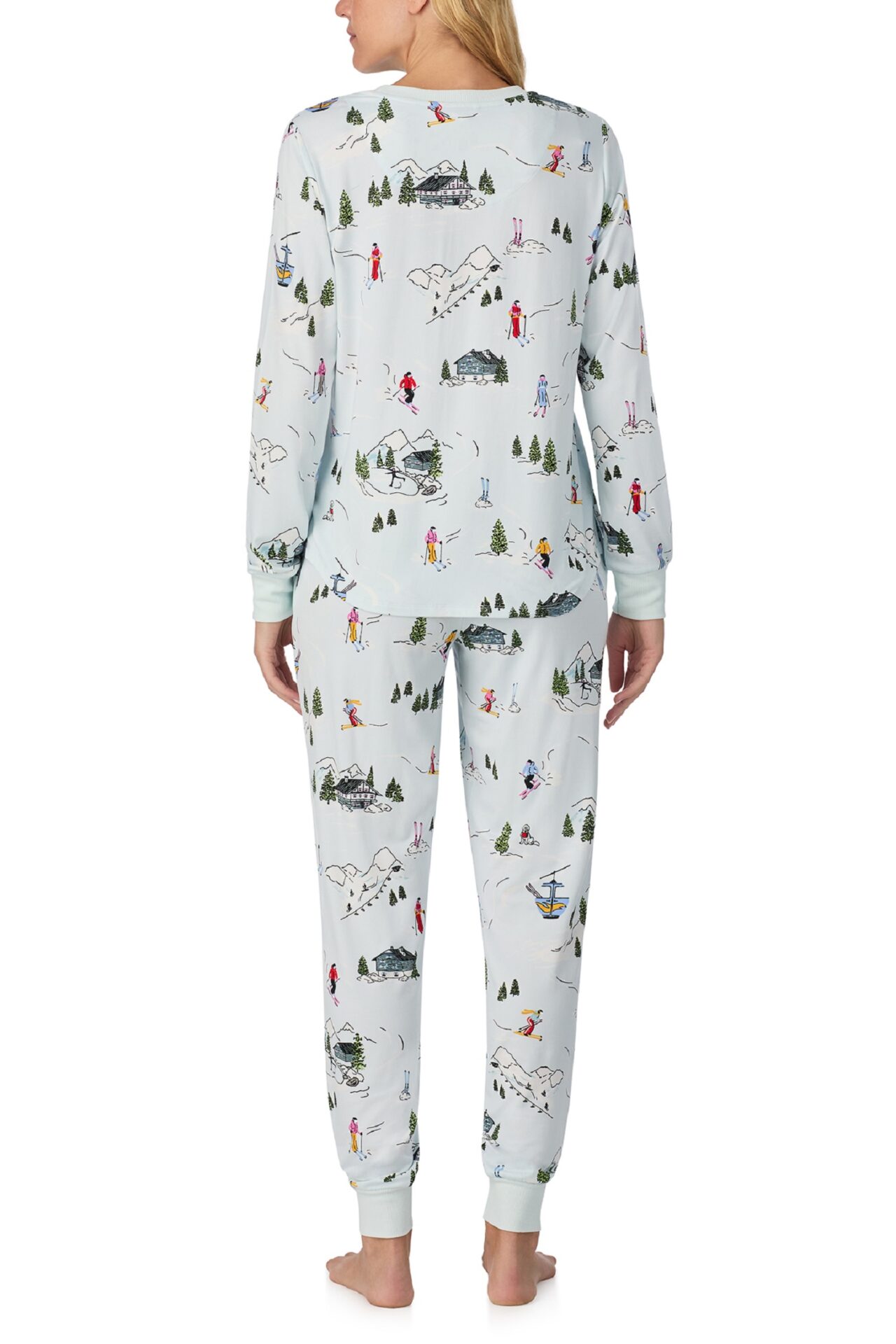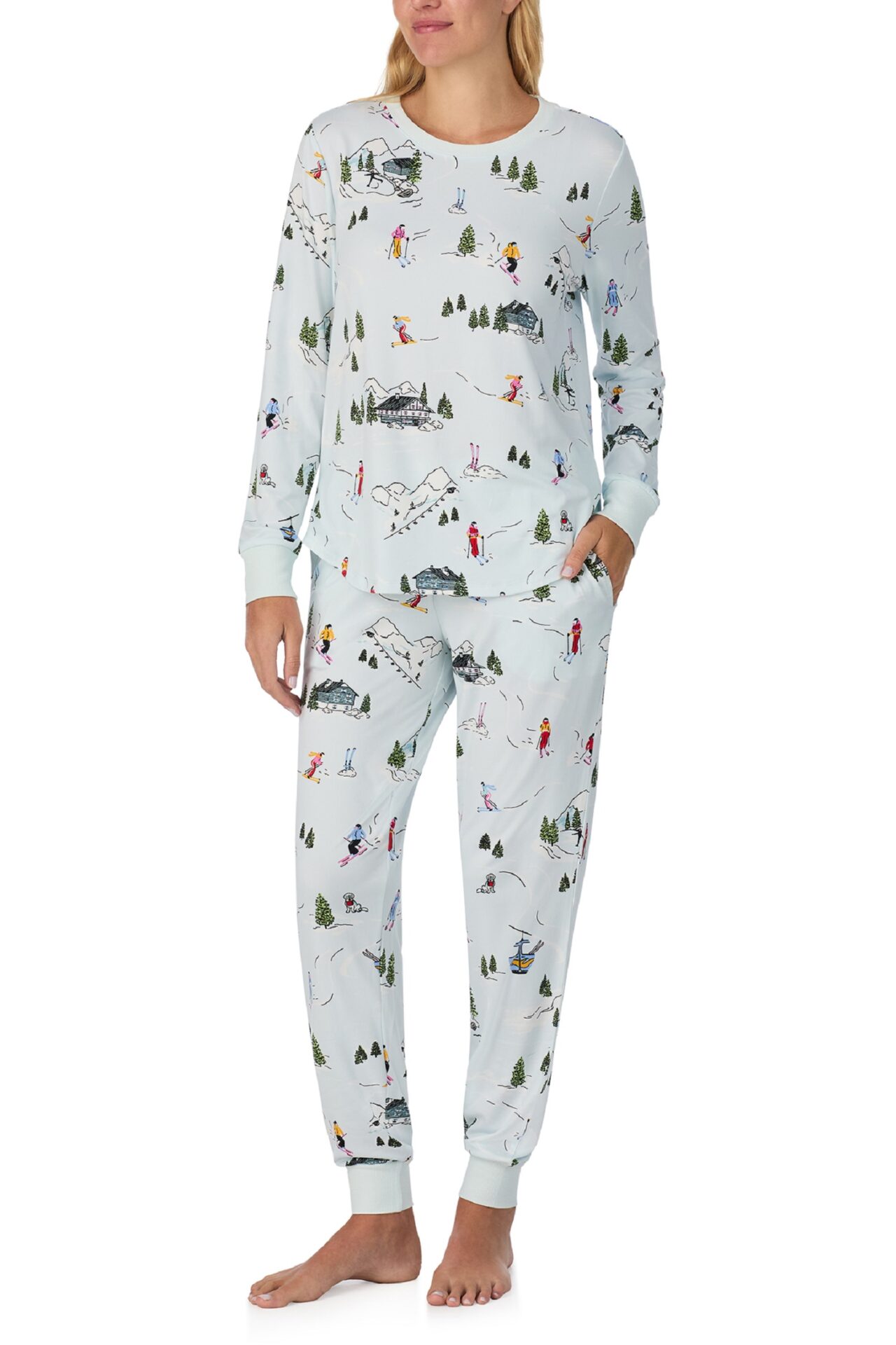 Piżama damska z kolekcji Kate Spade, wykona elastycznej dzianiny. Bluzka z długim rękawem i okrągłym dekoltem. Lekko zaokrąglony dół. Spodnie długie z wsuwanymi kieszeniami. Elastyczny pas z troczkami. Rękawy oraz nogawki wykończone ściągaczem.