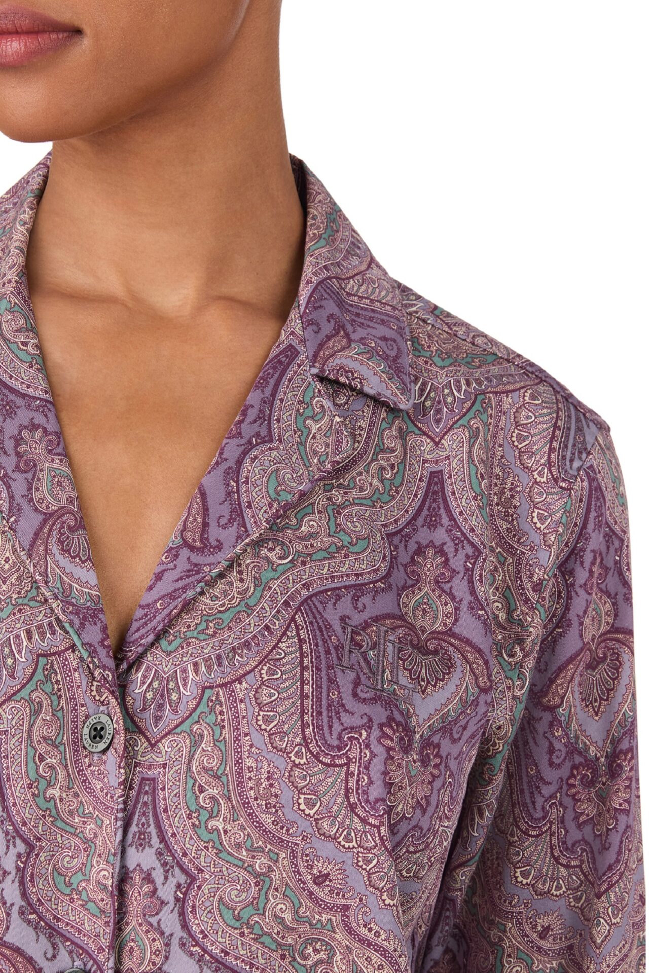 Piżama damska Lauren Ralph Lauren w kolorowy wzór paisley. Wykonana z materiału z dużą zawartością bawełny z lekkim połyskiem. Koszula z długim rękawem, z kołnierzykiem, zapinana na guziki. Na piersi wyhaftowane logo ,,LRL”. Spodnie długie, proste w pasie guma.