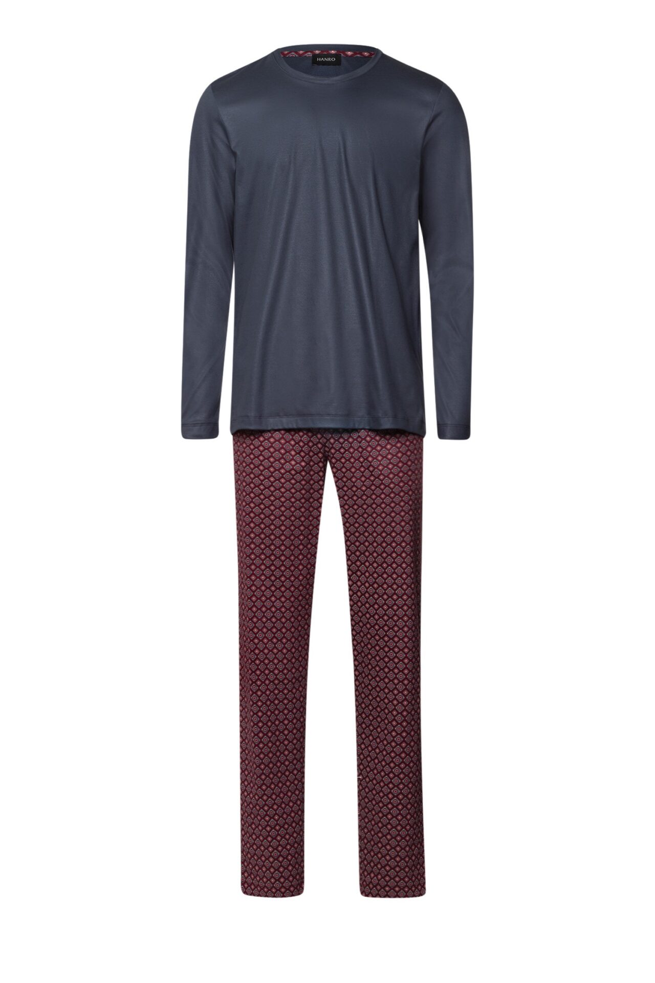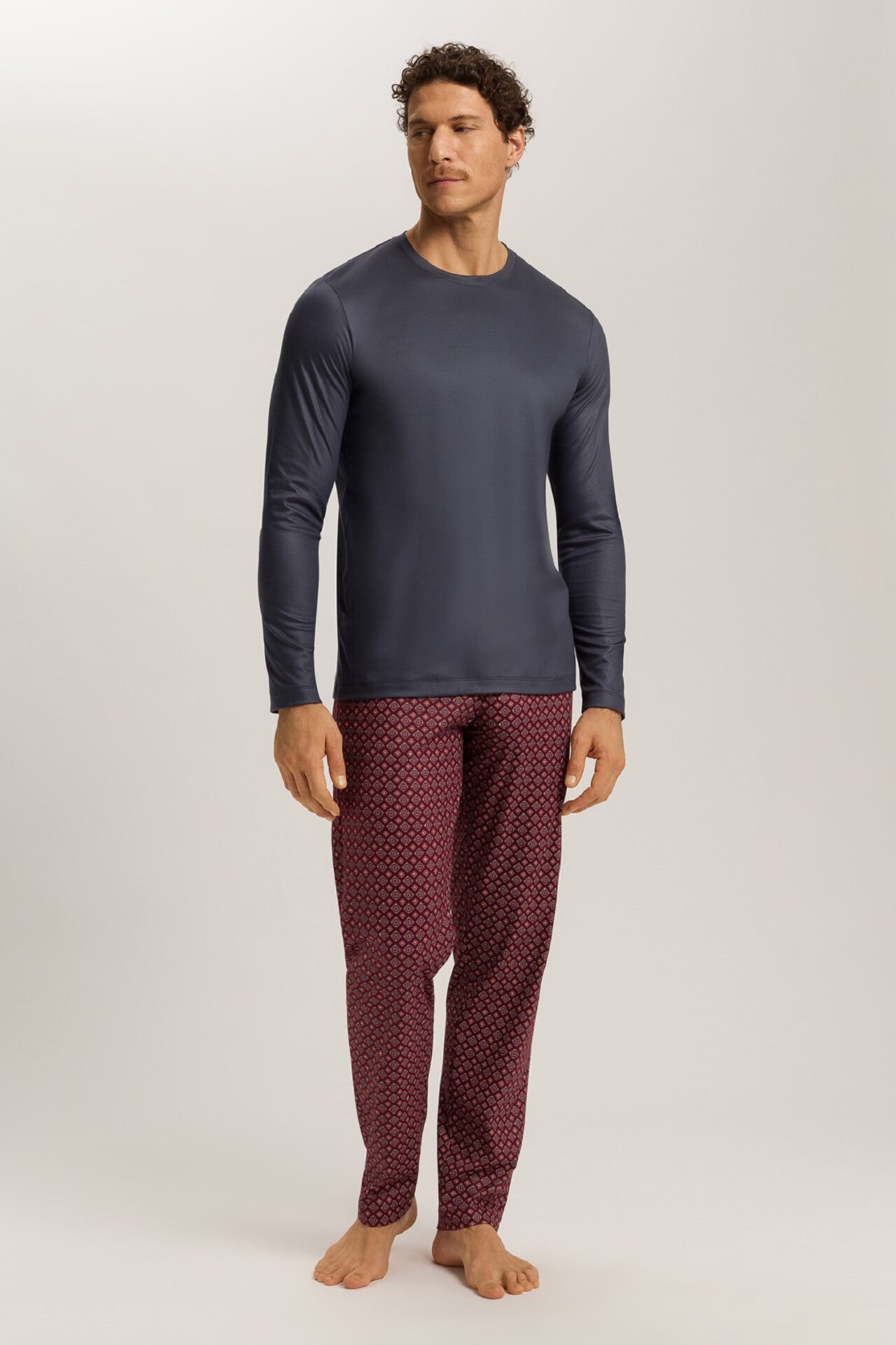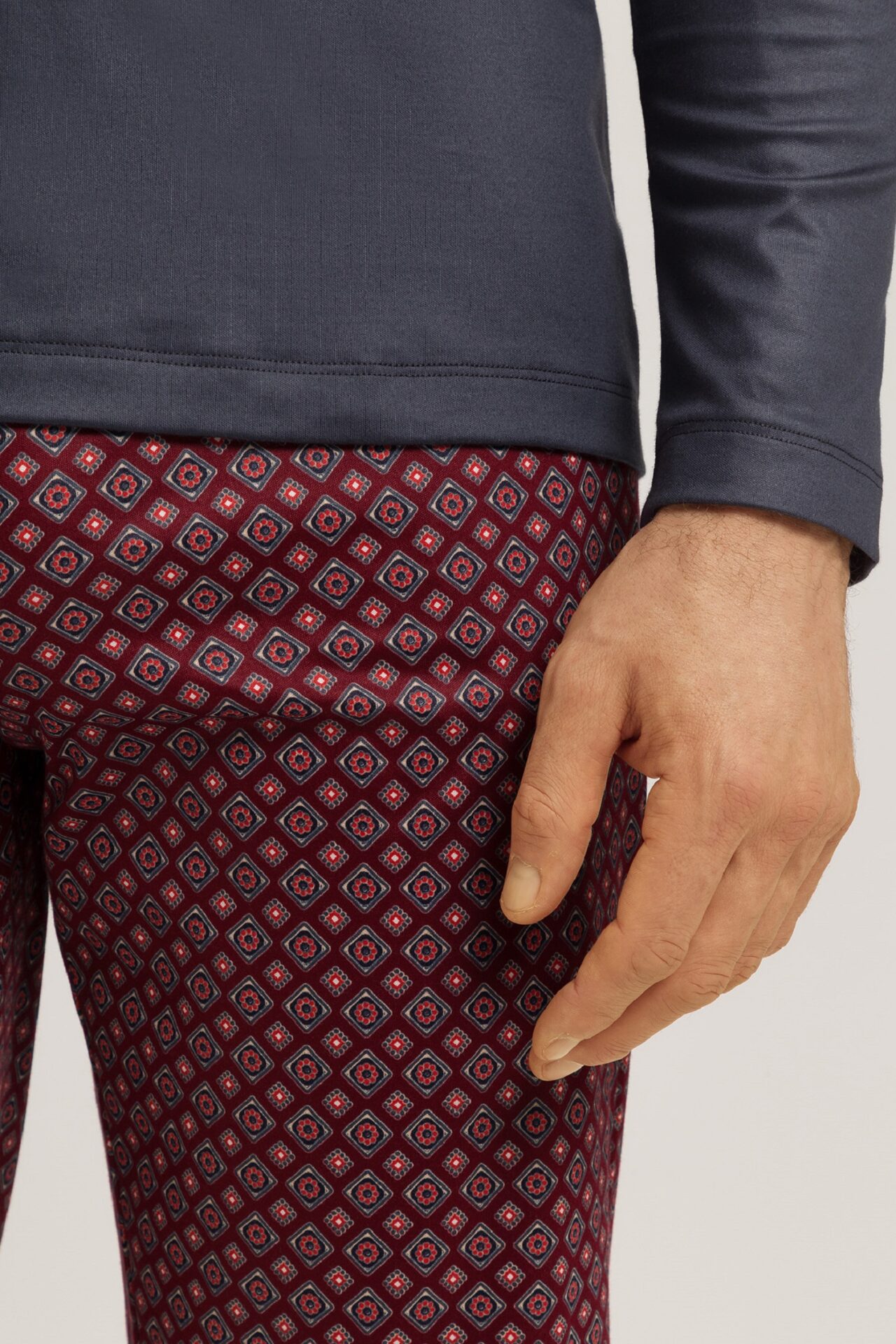 Bawełniana piżama męska z kolekcji Night & Day. Bluzka gładka z długim rękawem, okrągły dekolt. Spodnie długie w kolorowy nadruk, w pasie gumka, po bokach kieszenie.
