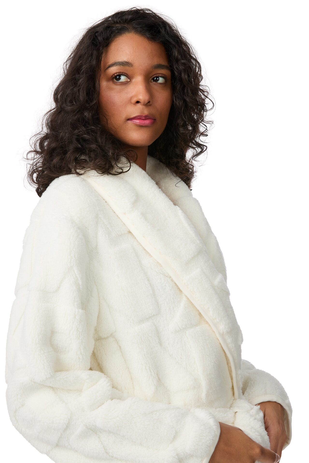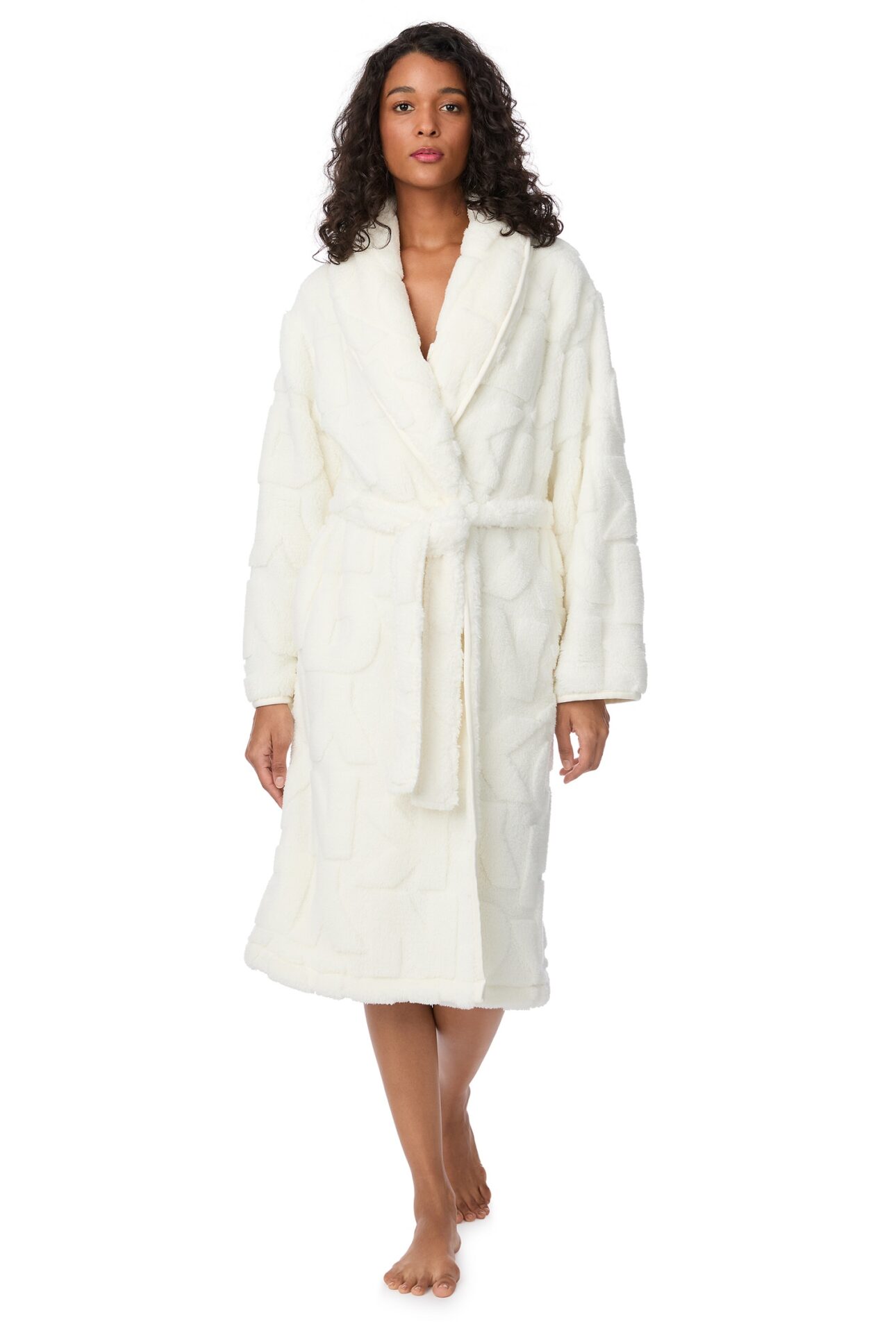 Szlafrok damski DKNY, wykonany z puszystego i miękkiego materiału z wytłoczonym logo. Klasyczny szalowy kołnierz. Wsuwane kieszenie. Wiązany w pasie. Kołnierz oraz rękawy wykończone lamówką. Długość ok. 112 cm.